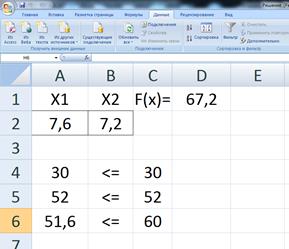 Рис. 6. Вкладка Данные В Excel вводим в соответствующие ячейки (рис. 7, 8) формулы математической модели задачи, записанной ранее.