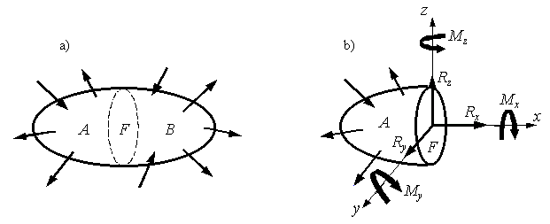 Қ атты дененің бір нү ктесіне сырттан кү ш ә сер етсе, кү ш дененің басқ а нү ктелеріне де ә сер етеді. Осы сыртқ ы кү штердің ә серінен пайда болатын, қ атты дененің ішкі нү ктелерінің бір-біріне ә сер етуші кү шін ішкі кү ш деп атаймыз. Ішкі кү штер қ има ә дісі бойынша анық талады. Бір AB денесіне тепе-тең дікте тұ рғ ан кез-келген кү штер жү йесі ә сер етсін делік(16.1а, сурет). Осы денені F жазық қ имасы арқ ылы екіге бө ліп қ арастырайық. Осы F қ имасының бетіндегі ішкі кү шті анық тау ү шін, дененің В бө лігін ойша алып тастайық жә не оның ә серін сә йкес ішкі кү штермен алмастырайық