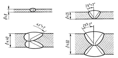 27.2-сурет. Тү йістіріп пісірудің шовтары. Тү істірілген қ осылыстар бө лшектердің қ алың дығ ына байланысты бірнеше жолмен жү зеге асырылады. Егер қ олмен пісірілген бө лшектердің қ алың дығ ы 5-8 мм-ге дейін жә не автоматты пісірілген бө лшектердің қ алың дығ ы 15 мм-ге дейін болса, жиектерін ө ң деудің қ ажеті жоқ болады. Ал қ алың бө лшектердің пісіріп қ осу кезінде жиектерін ө ң деген жө н. Егер шов бір жақ бетте ғ ана болса, бө лшектердің жиегін «V» тү рлі етіп алып, ал егер шов екі жағ ынан да жасалса онда, олардың жиектерін «Х» тү рлі етіп ө ң деу керек. Бұ л ә діспен қ алың дығ ы 40 мм-ге дейінгі бө лшектерді пісіріп қ осуғ а болады. Іс жү зінде тү йістіріліп пісірілген қ осылыс шовтың аймағ ындағ ы қ ауіпті қ иманың беріктігін табу арқ ылы есептеледі. Егер қ осылыс созылуғ а жә не иілуге жұ мыс істесе, онда пайда болатын кернеудің шамасы, яғ ни созылу мен иілу кернеулері былайша анық талады: