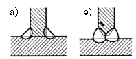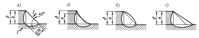 Мұ нда, Айқ астырып қ осу. Бұ лқ осылыстарды ә р тү рлі қ ималы бұ рыштық шовтармен орындайды: нормалдық (27.3, а-сурет), оның профилі тең бү йірлі ү шбұ рыш тү рінде болады; ойық (27.3, ә -сурет), жауапты конструкцияларда айнымалы жү ктеме ә сер еткенде қ олданылады, ойыс қ осылыс бө лшектің шовы негізгі металына бірігеді жә не кернеу концентрациясы аз болады. Бұ л қ осылыстың бағ асы да қ ымбат болады, себебі металл терең балқ ытылады жә не қ осымша механикалық ө ң деу жасалады; дө ң ес (27.3, б-сурет) – рационалды емес, ө йткені кереудің ү лкен концентрациясын тудырады; арнайы (27.3, с-сурет), профильдері тең бү йірлі емес тік бұ рышты ү шбұ рыш болады, айнымалы жү ктеме ә сер еткенде қ олданылады, ө йткені кернеу концентрациясын елеулі тө мендетеді. Шовтың