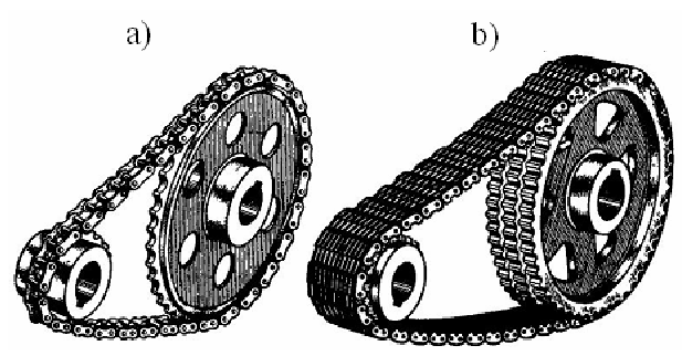 Шынжырлы берілістер. Шынжырлы берілістер қ азіргі заманғ ы машина жасауда кең інен қ олданылып келеді. Тек қ ана комбайнның бір тү рінде 14 шынжырлы беріліс кездеседі. Сондай ақ шынжырлы берілістер транспорттық машиналарда да кең інен қ олданылады. Жең іл автомобильдерде шынжырлы берілістер минутына 6000 – дай айналу жылдамдығ ын беріп кө птеген жылдар бойы жұ мыс істейді. Мұ най ө нерә сібінде қ олданылатын бұ рғ ылау жабдық тарында пайдаланылатын кө п тармақ ты шынжырлы беріліс Шынжырлы беріліс жетекші жә не жетектегі жұ лдызшалардан жә не оларды қ амтитын шынжырлардан тұ рады. Шынжырлы берілісте бірнеше жетекші жұ лдызшадар болуы мү мкін. Олар кө бінесе ауыл шаруашылық транспорт машиналарында қ олданылады. Ал шынжырдың ө зі топсалармен байланысқ ан бірнеше буындардан тұ рады. Шынжырлы берілістер иілгіш байланысты ілінісу берілістерне жатады. Шынжыр тартылғ ан бас жә не тә уелді жұ лдызшылардан тұ рады. Артық шылық атры: 1) тісті берілістерге қ арағ анда шынжырлы берілістер білік арасында қ озғ алысты елеулі осьаралық қ ашық тық тарда бере алады (8 м дейін); 2) ременьді берілістерге қ арағ анда: а) компактырақ; ә) ү лкен қ уатты бере алады (3000 кВт дейін), б) білікке ә сер ететін кү штер елеулі аз, ө йткені шынжырдың алдын-ала тартылысы аз, в) бірнеше жұ лдызшамен бір шынжыр кө мгімен қ озғ алысты бере алады. Кемшіліктер: 1) ілініске кірген кезде шынжыр буынының соқ қ ысынан шудың болуы, ә сіресе жұ лдызша тістерінің саны аз жә не қ адам ү лкен болғ анда; 2) майлау материадарын жеткізу қ иындығ ына байланысты шынжыр шарнирлерінің елеулі тез тозуы; 3) шарнирлердің тозуына байланысты шынжырдың ұ заруы, бұ дан тарту қ ұ рылғ ылары қ ажет болады; 4) қ озғ алысы тұ рақ сыз, осығ ан байланысты онда айнымалы кү штер пайда болады. Шынжырлы берілістер елеулі қ ашық тық та орналасқ ан параллель біліктер арасындағ ы қ озғ алысты беру ү шін станокты, транспорттық жә не басқ а машиналарда қ олданылады.
