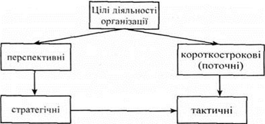 Рис. 3.1. Класифікація цілей діяльності організації залежно від строку їх досягнення Управління дуже рідко має справу з організаціями, які мають лише одну мету. Організація є системою, сукупністю взаємодіючих елементів, що складають цілісне утворення, яке має набір взаємопов'язаних цілей. Наприклад, такі організації, як " Адідас", " Кока-Кола" складаються із великої кількості самостійних підприємств, які мають свої плани виробництва і реалізації продукції та прибутків. У вітчизняній економіці, згідно з Господарським кодексом України, можуть створюватись різні форми підприємницької діяльності, до яких належать виробничі об'єднання, товариства, концерни, консорціуми, холдинг-компанії та інші. Організація як цілісна система складається з " керівної підсистеми" та " керованої підсистеми". Керівна підсистема складається з елементів, які забезпечують процес управління. Керована підсистема вміщує ті елементи, які забезпечують процес економічної діяльності. Отже, керівна і керована підсистеми - цілісний комплекс взаємопов'язаних та об'єднаних спільною метою елементів, що дозволяє виявляти властивості системи, її внутрішні та зовнішні зв'язки. Все вищевикладене торкається так званих формальних організацій. Формальна організація – це організація, що підкоряється класичним законам існування і розвитку організацій. Але є ще так звані неформальні організації. Неформальна організація – це структура (група) існує усередині формальної організації, де люди вступають у взаємодію одне з одним достатньо регулярно, але ці відносини неформальні (виробничі відносини, дружні стосунки тощо). Такі неформальні організації створюються в усіх сферах. Якщо мета і завдання неформальної організації співпадають з формальною, то організація існує, розвивається і досягає своєї мети; якщо цілі і завдання неформальної і формальної організації різні, то це може призвести до конфліктної ситуації, до кризи, розпаду або припинення існування формальної організації. Уміння керівників підпорядковувати мету і завдання неформальної організації загальним інтересам і меті формальної організації –засада успішної діяльності організації. Якщо державу розглядати як формальну організацію, то партії і рухи, що перебувають в опозиції до влади (уряду), можна розглядати як неформальні організації (але тільки, щодо держави, оскільки самі партії і рухи можна розглядати як організації, в яких також є лідери і опозиціонери, тобто формали і неформали). Слід зазначити, що не завжди керівники держави діють в межах законів і конституції, часто використовують неформальні організації, і якщо вони приводять до влади своїх прихильників, то тоді з неформальних вони стають формальними організаціями, а ті, хто програв вибори, колишні формали, можуть стати опозиціонерами, тобто неформалами. У роботі під поняттям " організація" завжди мається на увазі формальна організація. Характерними особливостями неформальних організацій є здатність до самоорганізації, саморегулювання внутрішніх відносин під впливом престижу, лідерства тощо. В інтересах ефективного управління доцільно розробляти стратегію відносин з неформальними організаціями, враховувати взаємодію цих відносин, ступінь впливу неформальних відносин на формальні і навпаки. Залежно від того, хто і якою мірою має право