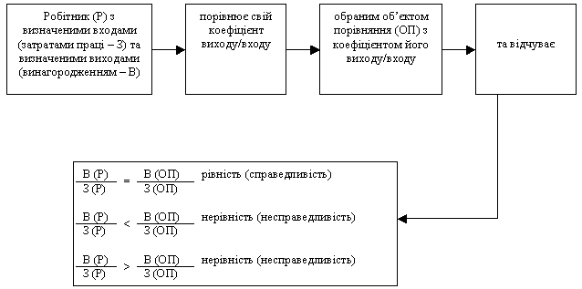 Якщо очікування високі, то сила спонукаючого мотиву зростає. Отриманий раніше позитивний досвід в аналогічних ситуаціях підкріплює сподівання. Отже, успіх посилює мотивацію. Навпаки, якщо очікування не справджуються, виникає відчуття марності зусиль, внаслідок чого зменшується мотивація. Позбавитися відчуття марності зусиль допомагає встановлення досяжних для даного конкретного робітника цілей діяльності й винагородження його таким способом, який він особисто цінує. 2. “Теорією справедливості” Стейсі Адамса передбачається, що люди суб’єктивно оцінюють співвідношення отриманої ними винагороди за виконання певної роботи до зусиль пов’язаних з її виконанням і порівнюють таке співвідношення з тим, що отримали інші робітники. За результатами порівняння відчуття: або справедливості, або несправедливості. В “теорії справедливості” виділяють такі основні складові (див.рис.5): - робітник – співробітник організації, який оцінює співвідношення винагорода / зусилля і спроможний відчувати справедливість / несправедливість; - об’єкт порівняння – будь-який інший співробітник даної організації, який використовується як база для порівняння коефіцієнтів виходу/входу; - “входи” – індивідуальні властивості робітника, які він вкладає у виконувану ним роботу (освіта, досвід, кваліфікація здібності, зусилля, що прикладаються для виконання роботи тощо); - “виходи” – все те що робітник отримує за виконання роботи (заробітна платня, премії, пільги, визнання заслуг, просування за службою тощо).
