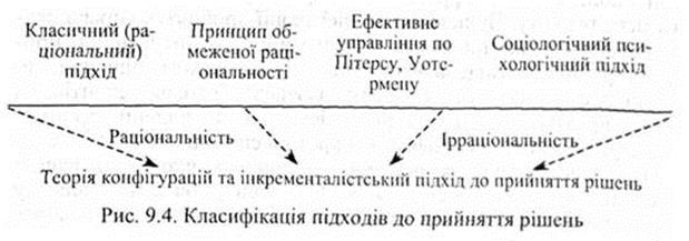 3. Всі існуючі підходи до вивчення процесу прийняття економічних рішень можна умовно представити у вигляді точок, розташованих на прямій між двома полюсами: з однієї сторони — абсолютна раціональність, орієнтація переважно на математичні категорії, з другої — абсолютна ірраціональність, сильний акцент на соціальні чи психологічні категорії (рис. 9.4).