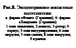Эксцентриково-лопастные вытеснители — устройства непрерывного действия. Они создают в продукте нормальные, объемные напряжения, не влияющие на физические свойства фарша и не вызывающие перераспределения его компонентов. Их конструкция позволят обрабатывать все виды фаршей. Вытеснитель состоит из цилиндрического ротора, в котором проделаны радиальные пазы для пластин. Пластины одинаковой длины скользят по внутренней поверхности корпуса, в котором ротор установлен эксцентрично. Это общий принцип конструкций, а реально устройство вытеснителей разнообразно. На рис. 8, а показан эксцентриково-лопастной вытеснитель для шприцов малой производительности (до 2500 кг/ч). В его роторе 3 проделаны восемь радиальных пазов, в которые вставлены четыре пластины 2, имеющие одинаковую длину. Пластины в средней части имеют прямоугольные углубления, которые позволяют собрать их в один узел. Концы пластин образуют восемь лопастей, которые перемещают фарш внутри корпуса 4. Контур внутренней поверхности корпуса обеспечивает создание шести зон: замыкание 1, вакуумирование 5, загрузка 6, сжатие 7и выгрузка 8. В то же время диаметральное расстояние между стенками должно быть равно длине пластины, проходящей через центр эксцентрично установленного ротора. Подобная схема обеспечивает создание замкнутых полостей между соседними пластинами, стенками ротора и корпуса. В точке 1 стенка ротора примыкает к стенке корпуса, при этом объем полости равен нулю. Далее между ними образуется зазор, возникают полости, из которых вакуумным насосом отсасывается воздух. В зоне 6 наибольший объем полости, и в нее поступает из загрузочного бункера фарш. В этом случае вакуумирование преследует две цели: 1) быстрое и полное заполнение полостей фаршем и 2) удаление воздуха из фарша (деаэрация). Затем в зоне 7 постепенно уменьшается зазор между ротором и стенками, что приводит к сжатию фарша. И наконец, в зоне 8 фарш выдавливается в отводящий патрубок. В вытеснителях большей производительности число пластин доходит до 16... 18, а диаметры ротора и корпуса существенно увеличиваются. Так, в вытеснителе (рис. 8, б) фирмы «Хандтман» (Германия), производительностью до 10000 кг/ч, установлено 16 пластин 2 одинаковой длины. Пластины упираются одним концом в стенку корпуса 4, а другим — в кулачок 9. Профиль стенки корпуса и кулачка должны быть эквидистантны и обеспечивать наилучшее получение тех же зон, которые были рассмотрены выше. Все детали вытеснителя изготавливают из нержавеющих сталей и подвергают полировке. В некоторых вытеснителях пластины изготавливают из полимерных материалов. Тщательность профилирования кривых и чистота поверхностей должны свести к минимум силы трения в контакте пластина-корнус, износ деталей и, соответственно, попадание продуктов износа в фарш. В современных шприцах роторы эксцентриково-лопастных вытеснителей приводятся во вращение электромеханическим или гидравлическими приводом. Используют двигатели постоянного тока, обеспечивающие возможность непрерывного регулирования частоты вращения ротора. Другим типом электродвигателя являются трехфазные асинхронные электродвигатели с частотным регулированием скорости вращения. Эти двигатели обеспечивают большой диапазон изменения скорости с высокой точностью позиционирования. Они проще двигателей 