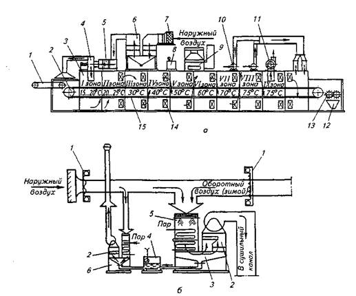 Рис. 5. Ленточная конвективная сушилка фирмы «Марубени» (Япония): а — схема сушилки: 1 — качающийся конвейер; 2 — сушильный конвейер; 3 — зональный туннель; 4 — нагнетающий вентилятор; 5 — камера регулирования температуры воздуха; 6 — кондиционер; 7 — фильтр; 8 — насосная станция; 9 — регенератор; 10 — нагнетающие вентиляторы; 11 — вентилятор для выброса отработавшего воздуха; 12 — приемная воронка; 13 — дробилка; 14 — калориферы; 15 — лента конвейера; б — установка для подготовки воздуха: 1 — воздушные фильтры; 2 — фильтрующий слой; 3 — кондиционер; 4 — насос; 5 — форсунки; 6 — регенератор