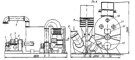 Рис. 6. Конвективная сушилка КТ-60: 1, 6 — электродвигатели вентиляторов; 2 — электродвигатель привода мешалки; 3 — редуктор; 4, 7 — вентиляторы; 5 — отводящий воздуховод; 8 — всасывающий воздуховод; 9 — калорифер паровой; 10 — светильник; 11 — смотровое окно; 12 — люк для загрузки; 13 — люк для обслуживания; 14 — мешалка; 15 — теплоизоляция; 16 — корпус; 17 — воздуховод