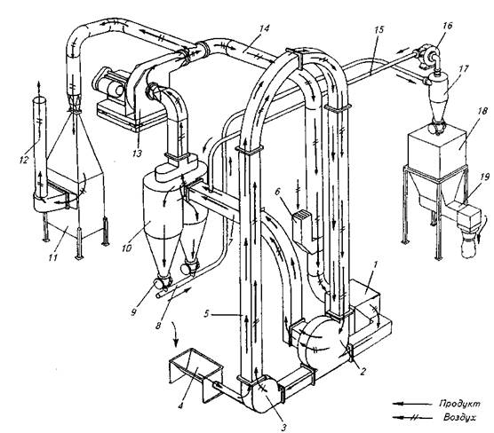 Рис. 7. Пневматическая конвективная сушилка фирмы «Сторк-Дюк» (Голландия): 1 — калорифер; 2 — сепаратор; 3 — измельчитель; 4 — шнековый питатель; 5 — сушильный канал (труба); 6 — патрубок для подачи свежего воздуха; 7 — воздуховод для высушенного продукта; 8 — пневмотранспортер; 9 — шлюзовой затвор; 10, 17 — циклоны; 11 — промыватель Вентури; 12 — отводящий воздуховод; 13, 16 — вентиляторы; 14, 15 — рециркуляционные трубопроводы; 18 — бункер; 19 — шнековый дозатор