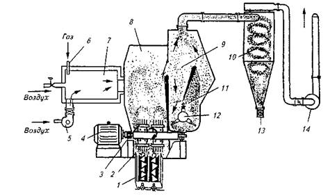 Рис. 8. Схема сушильной установки Я5-ФДБ: 1 — двухшнековый питатель; 2 — камера дробления; 3 — молотковая дробилка; 4 — электродвигатель; 5 — воздуходувка; 6 — горелка; 7 — теплогенератор; 8 — камера сушки; 9 — камера досушки; 10 — циклон; 11 — камера повторного дробления; 12 — дробилка; 13 — шлюзовой затвор; 14 — вентилятор