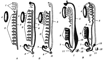 Рис. 14.36. Эволюция почки и мочеполовых каналов. А — нейтральное зародышевое состояние; Б — анамнии; В — амниоты: I—самки, II—самцы; 1—предпочка, 2—первичная почка, 3—канал предпочки, 4—половая железа, 5—мюллеров канал, 6—вольфов канал, 7—мочевой пузырь, 8—клоака, 9—вторичная почка, 10—матка, 11—мочеполовой синус, 12—задняя кишка, 13—половой член, 14—мочеточник вторичной почки, 15—мужская «маточка» Пороки В эмбриогенезе человека закладываются парные вольфовы и мюллеровы каналы. Позже в зависимости от пола происходит их редукция. Рудимент мюллерова канала у мужчин располагается в предстательной железе и называется мужской маточкой — utriculus masculinus. Нарушение редукции вольфовых каналов у жен ., которые располагаются по бокам от влагалища. Эта аномалия опасна возможностью образования кист и злокачественного перерождения. У двоения матки (1 случай на 1000 перинатальных вскрытии) Распространенный порок, развиваются как результат нарушения срастания мюллеровых каналов. Удвоение полового члена - нарушение срастания парных зачатков полового члена в эмбриогенезе человека (рис. 14.37).