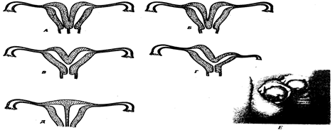Рис. 14.37. Аномалии матки и полового члена у человека. А—Д—различные формы удвоения матки и влагалища; Е—удвоение полового члена КОПУЛЯТИВНЫЕ ОРГАНЫ (латинское copula - соединение, связь, узы), у самцов животных органы для введения спермы в половую систему самки, у самок - для принятия совокупительного органа и нередко для сохранения спермы; имеются у животных с внутренним оплодотворением. Функцию копулятивных органов могут выполнять конечности (у ракообразных, пауков), выросты плавников (у рыб) и другие.