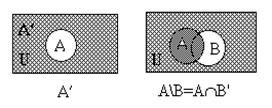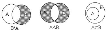 Многие свойства множеств удобно иллюстрировать при помощи диаграмм Эйлера-Венна. При этом удобно множество изображать кругами или другими связными фигурами. U- прямоугольником, внутри него остальные множества. Например, легко увидеть(нарисуйте), что (A_B) \B=А не всегда верно, а если А_B=_, то верно.