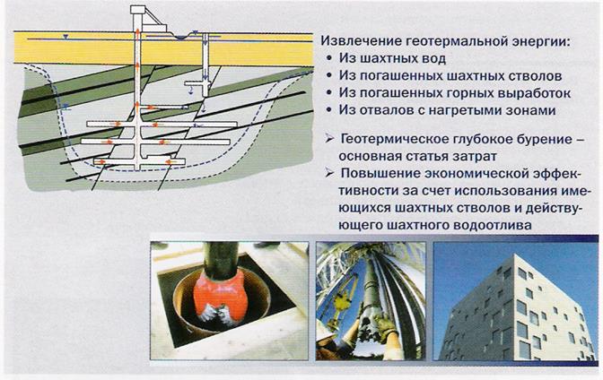Геотермальная энергия может использоваться для выработки тепловой и электрической энергии. Различают в основном близкое к поверхности и глубокозалегающее тепло. Геотермальная теплота с глубины примерно 5 – 10 м имеет однородную температуру и в большинстве случаев с помощью тепловых насосов подается непосредственно для обогревания или охлаждения. Геотермальная энергия глубокого залегания делится на энергию с высоким и низким теплосодержанием. Месторождения с высоким теплосодержанием приурочены к тепловым аномалиям, как правило, связанным с вулканической активностью; это тепло используется во всем мире для выработки электроэнергии. Месторождения с низким теплосодержанием, которые, к примеру, имеются в Руре и Сааре, можно разделить в соответствии со следующими видами использования геотермальной энергии. Гидротермальные системы, в которых термальная вода циркулирует в грунтовом слое между двумя скважинами. Петротермальные системы, так называемые сухие нагретые породы, в которых специально введенный теплоноситель циркулирует по трещинам и разломам между двумя глубокими скважинами. Система глубоких геотермических зондов, в которой среда-носитель циркулирует в замкнутом контуре внутри скважины. Добыча геотермальной энергии при строительстве туннелей (широко распространенный способ в Швейцарии и Австрии), а также из глубоких шахт. Сочетание геотермальной энергии с возможностями использования участков бывших горных разработок можно рассматривать как идеальное. При использовании рудничной воды в качестве теплоносителя главными объектами затрат являются инвестиционные затраты, например, связанные с бурением глубоких геотермических скважин, а также текущие эксплуатационные расходы. Энергия сама по себе поступает в распоряжение, казалось бы, бесплатно. Если для доступа к рудничной воде воспользоваться бывшими шахтными стволами, то можно заметно снизить объем капиталовложений. Разумеется, уже при засыпке или санировании шахтных стволов необходимо обеспечить доступ к рудничной воде и, таким образом, сохранить их для возможного геотермического использования. Помимо экономии затрат на вскрытие и эксплуатацию дополнительные преимущества состоят в том, что за счет обширных подземных гидравлических соединений в пределах каменноугольных бассейнов обеспечивается доступ к практически неограниченному геотермическому потенциалу, температура которого остается постоянной круглый год. Геотермальная энергия существует всегда, независимо от времени дня и сезона, а также независимо от погоды. Геотермальная энергия может служить, таким образом, в качестве базового энергоносителя. Рудничная вода с температурой от 25 до 40 °С насосами подается на поверхность. В теплообменнике вода отдает свое тепло. Затем вода через вторую находящуюся на достаточном удалении скважину снова закачивается в массив. Старые шахтные стволы идеально для этого подходят. Относительно небольших затрат требует использование уже имеющихся трубопроводов, либо разбуривание старых трубопроводов или засыпанных стволов. Еще одна возможность состоит в том, чтобы использовать воду из имеющихся систем рудничного водоотлива в энергетических целях, отбирая тепло с помощью теплообменника. В качестве примера можно привести открытие недавно Школы 