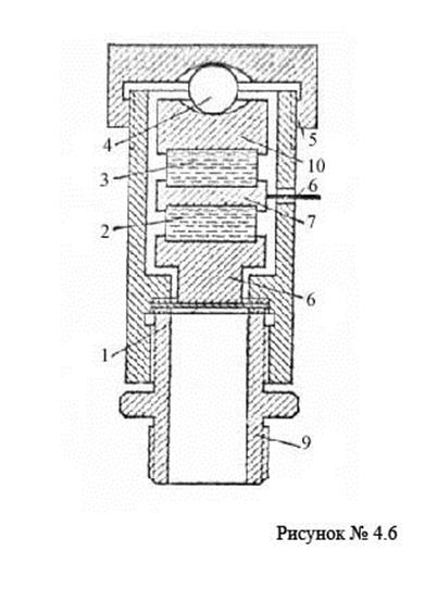 В обеих конструкциях чувствительным элементом является нагретая путем пропускания электрического тока платиновая нить 1, расположенная в вакуумном баллоне 2. При увеличении разрежения среды её теплопроводность будет уменьшаться, следовательно, нагретая платиновая нить будет хуже отдавать тепло стенкам баллона, в результате чего ее температура будет возрастать. Измеряя температуру нити, можно судить о величине вакуума. Чтобы исключить теплопередачу от нити к стенкам баллона за счет лучеиспускания, максимальная температура нити должна быть примерно 100 º С. Эти два типа вакуумметра различаются только способом измерения температуры, нити. В вакуумметре сопротивления температуру измеряют термометром сопротивления, которым служит сама нить, а в термопарном вакуумметре — термопарой 4. Датчик к измеряемой схеме подключается через электрические вводы 3, a к объекту измерения — через соединительную трубку 5. В вакуумметрах с термосопротивлением измерение температуры нити и ее нагрев путем пропускания электрического тока осуществляются при помощи мостовой схемы, в одно из плеч которой включена нить вакуумметра. Температура нити измеряется милливольтметром, установленным в диагональ моста. Во второй диагонали находится источник питания моста постоянным током. В термопарных вакуумметрах температуру нити накала измеряют хромель-копелевой термопарой, которая соединена с нитью при помощи крючка из тонкой проволоки. Пьезоэлектрические манометры. Пульсирующие с высокой частотой давления измеряют с помощью манометров, построенных на использовании пьезоэлектрических эффектов. Под пьезоэлектрическим эффектом понимают появление электрических зарядов на поверхности некоторых кристаллических диэлектриков при их деформации. Чувствительным элементом в пьезоэлектрических манометрах, преобразующим механические напряжения в колебания электрического тока, являются пластины из кварца, титаната бария или керамики типа ЦТС (цирконат-титанат свинца). Датчик пьезоэлектрического манометра представлен на рис. 4.6. Измеряемое, давление через мембрану 1 действует на два пьезоэлемента 2 и 3 из пьезокерамики ЦТС, расположенных так, что на их внутренних гранях, соприкасающихся с металлической прокладкой 7, возникают одноименные заряды. Потенциал с внутренних граней пластинок снимается тщательно изолированным проводником 6, присоединенным к прокладке 7, а с внешних граней пьезоэлементов — через корпус и металлические прокладки 8 и 10, мембрану 1 и шарик 4. Применение шарика 4 и колпачка 5 способствует более равномерному распределению контактного давления по поверхности пластинок. Штуцер 9, зажимающий мембрану 1, служит для присоединения чувствительного элемента к объекту измерения. Пьезоэлементы располагают обычно таким образом, что отрицательные электрические заряды возбуждаются на электроде 7 и от него по проводнику 6 подаются к измерительной схеме прибора.