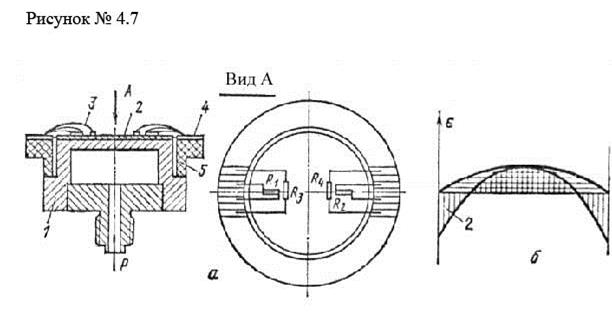 Положительные заряды через корпус отводятся на землю. Величина электрического заряда прямо пропорциональна давлению; q=kPS (4.12) где q — заряд, Кл; k— пьезоэлектрическая, постоянная, Кл/Н; Р—давление, Па; S — поверхность пластин, м². Измерения заряда осуществляют обычно сложной электронной схемой. Заряды, возникающие на пьезоэлементах, не могут сохраняться длительное время из-за утечек в элементах измерительной схемы, поэтому пьезоэлектрический метод применяют для измерения быстроменяющихся давлений. Тензометрические манометры. Тензометрический метод измерения давления заключается в непосредственном преобразовании деформации упругого чувствительного элемента (мембраны) под воздействием давления в изменение электрического сопротивления резисторов, закрепленных на этом элементе. Это изменение сопротивления преобразуется электрической измерительной схемой в электрический выходной сигнал, пропорциональный величине измеряемого давления. Резистор, сопротивление которого изменяется в зависимости от его деформации, называется тензорезистором. Зависимость изменения электрического сопротивления Δ R тензорезистора от давления Р определяется по формуле Δ R=kRP (4.13) где k — коэффициент тензочувствительности. Схема тензометрического манометра приведена на рис. 4.7, а. Манометр имеет цилиндрический корпус 1, образующий в верхней части упругую мембрану диаметром 9, 6 или 14, 4 мм, а в нижней — штуцер для подвода измеряемого давления Р. К мембране припаяна круглая сапфировая пластина 2, на поверхность которой нанесены тонкопленочные полупроводниковые тензорезисторы R1—R4 из монокристаллического кремния, ценным свойством которого является большое значение коэффициента тензочувствительности.