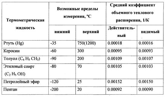 Для измерения температур в лабораторных условиях и промышленной практике широко применяют стеклянные жидкостные термометры, являющиеся самым старым видом термометров. Их характеризует достаточно высокая точность, невысокая стоимость, простота эксплуатации. Принцип действия термометра основан на зависимости между температурой и объемом термометрической жидкости, заключенной в стеклянной оболочке. Зафиксировать изменение положения верхней границы столбика жидкости возможно вследствие различия коэффициентов объемного теплового расширения жидкости и стекла. Из-за увеличения объема резервуара видимое изменение объема жидкости ниже действительного. Наиболее широко в качестве термометрической жидкости используется ртуть. Применяют также органические заполнители: толуол, этиловый спирт, керосин, пентан и т. п. В табл.3 приведены температурные пределы некоторых, термометрических жидкостей и их средние коэффициенты расширения. Наибольшее распространение получили термометры со ртутным заполнением, так как ртуть обладает наилучшими свойствами: находится в жидком состоянии в широком диапазоне температур (верхний предел может быть доведен до 1200 °С с помощью увеличения давления в капилляре и применения для изготовления термометра плавленого кварца); не смачивает стекла, что позволяет использовать капилляры с небольшим диаметром канала (до 0, 1 мм) и обеспечить высокую точность измерения (ртутные образцовые термометры 1-го разряда имеют доверительную, погрешность ε = 2σ = 0, 002 ÷ 0, 2 °С). Из табл. 3 видно, что ртуть имеет в 6—8 раз меньший коэффициент объемного расширения, чем другие заполнители. Это снижает чувствительность ртутных термометров. Однако для термометров, градуированных при неполном погружении, погрешности из-за выступающего столбика будут в 6—8 раз меньше, чем у нертутных (при прочих равных условиях измерения). Таблица 3 Параметры термометрических веществ для стеклянных термометров.