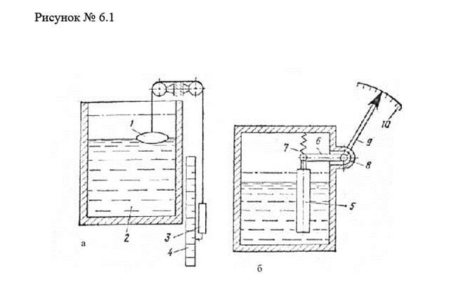 Простейшими уровнемерами, применяемыми для контроля уровня жидкости, находящейся в резервуаре под атмосферным давлением, являются поплавковые уровнемеры, схема которых показана на рис. 6.1, а.