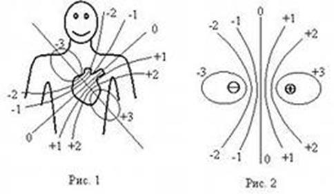 Электрокардиография – это метод регистрации кривой, отражающей электрические процессы, происходящие в сердечной мышце в различные фазы её активности. Эта кривая называется электрокардиограммой. Сигналы ЭКГ регистрируются с поверхности тела. Как возникают электрические потенциалы на сердечной мышце? Единой и общей теории происхождения ЭКГ нет, но основы этого метода исследования известны. Электрическая активность сердца является результатом циклического передвижения ионов в клетках и межклеточной жидкости миокарда. В движении участвуют катионы K+, Na+ и Ca++ и анионы Cl- и HCO3-. Поверхность желудочков сердца можно рассматривать как обширную единую клетку. А у клеток, как известно, всё время происходит смена зарядов на поверхности и внутри (за счёт перетекания-диффузии ионов) сердца. Закономерно меняющееся во время возбуждения сердца величина и направление электрического потенциала сердца сопровождается изменением потенциалов также на поверхности тела. А уже с поверхности тела эти потенциалы можно снимать, поместив на кожу электроды. Места нахождения электродов называются отведениями. На следующем рисунке показана картина мгновенного распределения потенциала, созданного сердцем, на поверхности тела. Рядом с фигуркой человека на рисунке показано распределение потенциала в системе двух равных по величине, но противоположного знака, зарядов. Такая система называется диполем. Из сравнения с левой картинкой видно, что заряды на поверхности сердца практически образуют дипольную систему. Линия, соединяющая два заряда, является осью диполя. Иначе эту линию называют вектором поляризации, если линия направлена от отрицательного заряда к положительному. На рисунке видно, что в зафиксированный момент ось направлена слева направо вниз.