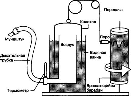 В норме На космических аппаратах США применялась импедансная пневмография. Это разновидность реографии. Дыхательное изменение импеданса при расположении электродов в шестом межреберье слева и справа по среднеключичной линии прямо пропорционально величине лёгочной вентиляции. В приборе «Нейролаб», который применялся в последние 5 – 6 лет функционирования станции «Мир», также был канал импедансной пневмографии для определения лёгочной вентиляции. Спирометрия Путём спирометрии измеряется жизненная ёмкость лёгких (ЖЕЛ).Это разность полного вдоха и полного выдоха. Применяются для этого водный и сухой спирометры (последний тип называется спирометром Н.А. Аганджаняна). Он представляет собой крыльчатый счётчик расхода. Ниже приведена схема водного спирометра.