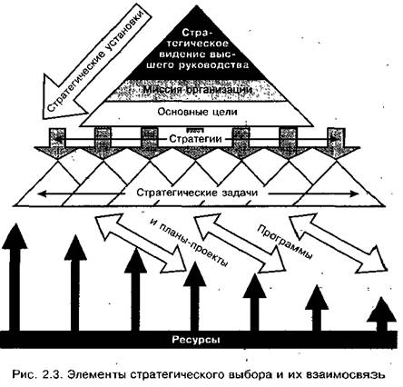 Процесс планирования стратегии встречает ряд сложностей при его освоении. Основная трудность связана с тем, что процесс принятия предварительных решений находится в зависимости от структуры полномочий в организации. Новая стратегия, как правил о, разрушает сложившийся в организации тип взаимоотношений и может войти в противоречие с политикой руководства. Естественная реакция на это — борьба против любых нововведений, нарушающих традиционные взаимоотношения и структуру полномочий. Другая существенная проблема заключается в том, что внедрение стратегического планирования приводит к конфликту между прежними видами деятельности (оперативным управлени-ем), обеспечивающими получение прибыли, и новыми. В организациях на первых стадиях внедрения стратегического планирования нет ни соответствующей мотивации, ни склонности мыслить стратегически. Следующая проблема связана с тем, что организации обычно не располагают необходимой для эффективного стратегического планированная информацией ни о себе, ни о внешнем окружении. К тому же, как правило, отсутствуют у них и компетентные управляющие, способные заниматься выработкой и реализацией стратегии. 2.2.2. Элементы стратегического выбора Альтернативность — важнейшая отличительная черта процесса планирования стратегии, связанная с необходимостью вести постоянный стратегический выбор. Основными элементами этого выбора являются миссия и цели, стратегии, стратегические задачи, программы, ресурсы и способы их распределения. Элементы стратегического выбора представлены на рис. 2.3. Понимание взаимосвязи элементов стратегического выбора важно для осознания сложности процесса планирования стратегии и необходимости создания системы стратегического управления, помогающей преодолеть эти сложности. В табл. 2.1 приведен пример, иллюстрирующий содержание элементов стратегического выбора, между которыми существуют взаимосвязи, показанные на рис. 2.3.