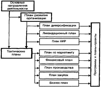 Рис. 2.18. Система планов развития организации Первые две группы планов являются основным продуктом стратегического планирования. Эти планы должны в последующем трансформироваться в тактические и планы-проекты, поскольку они могут быть реализованы лишь через них. К тому же проекты служат обоснованием выбранных на более ранних стадиях стратегий развития организации. Следовательно, тактические планы и проекты также частично входят в систему стратегического планирования. 2.4.4.1. Основные направления деятельности Этот план еще называют стратегическим. Он является вершиной системы планов, потому что характеризует основное назначение организации, ее цели и стратегии. Этот план служит ориентиром для всех прочих планов. Одновременно он служит и ограничением при принятии решений относительно основных направлений деятельности (продуктов и услуг) и рынков. Стратегический план включает следующие разделы: 1. Миссия и цели организаций, через которые выражается будущее организации, каким его представляет себе руководство. 2. Анализ состояния и перспектив развития внешней среды организации по какому СХП. 3. Анализ состояния и прогноз развития конкуренции по каждому СХП. 4. Анализ сильных и слабых сторон организации в разрезе СХП и отдельных функциональных зон. 5. Цели и стратегии отдельных СХП. 6. Общий целевой портфель организации в разрезе СХП 7. Планы мероприятий и бюджеты для реализации функцио 8. Ресурсы, необходимые для реализации стратегии организации и планов развития. 9. Основные этапы реализации стратегии во времени. 10. Оценка вероятности реализации стратегии. 11. Финансово-экономическая оценка стратегического плана. 2.4.4.2.План развития организации Он определяет мероприятия, которые необходимы для создания новых поколений продуктов и услуг, более четко очерчивает пути выхода на новые позиции, установленные в «основных направлениях деятельности». План развития дает ответ на вопросы: какие ожидаются условия для товаров и услуг организации? какие должны быть условия и климат внутри организации, чтобы облегчить создание новых видов продукции и выявление новых рынков сбыта? каковы имеющиеся ресурсы для создания новых видов продукции и услуг? План развития служит ориентиром для разработки: плана диверсификации, который характеризует создание новых видов продукции, услуг и рынков, призванных дополнить или заменить выпускаемую продукцию; ликвидационного плана, который показывает, от каких элементов организация должна освободиться (от продуктов, услуг, собственности или структурных подразделений); плана НИР, в котором отражены мероприятия по разработке новых товаров и технологических процессов с учетом существующего спроса или новых рынков для уже производимых товаров и услуг. План НИР затрагивает все элементы организации — продукты, рынки, финансы и управление. 2.4.4.3. Тактические планы Эти планы также называют планами текущей деятельности или планами прибыли. Они ориентированы на те мероприятия, с помощью которых выпускаемые товары и услуги производятся и поступают на существующие рынки. Планы текущей деятельности подкрепляются планами для каждой функциональной зоны: маркетинг, финансы, производство, закупки и т.д. Эти планы тесно увязаны со стратегическим планом, хотя и не являются его частью. Тактические планы служат 