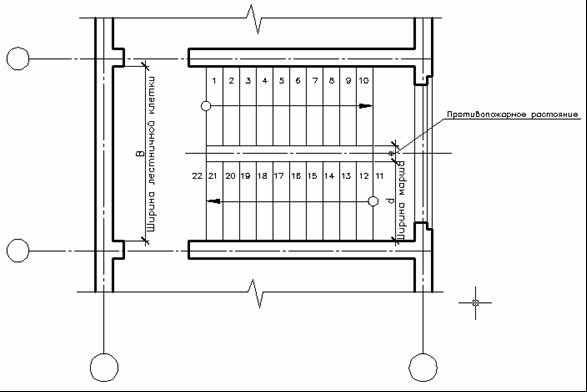 4.5 Розрахунок сходової клітки, її елементи. 1) Викреслюємо фрагмент плану будівлі (сходову клітку) М 1: 50 з встановленням розмірів. 2) Визначаємо по кресленню ширину сходової клітки «В». Наприклад В=2220мм Ширіна сходової клітки «В» дорівнює сумарній ширині обох маршів плюс проміжок між ними. Проміжок, який необхідний для пропуску пожежного шланга, має бути не менш 100 мм. Приймаємо ширину маршу d не менше 1050мм (кратно 50 мм) В = 2 * d +(100 …150) мм В = 2*1050+120 =2220 мм 3) Визначаємо довжину горизонтальної проекції маршу «L» Передбачимо, що висота поверху Н == 3000 мм, ширина маршу 1050 мм, зазор між маршами 120 мм, ухил сходів 1: 2. Для цього ухилу підбирають сходинки розмірами 150х300 мм. Висоту подступенка приймають рівною 135...180 мм приймаємо h= 150 м Ширіну проступи - 250... 300 мм. Приймаємо b=300 мм Ширіну сходових майданчиків приймає не менше ширина маршу і не менше 1200 мм, в будівлях з ліфтами майданчика мають бути шириною не менше 1600 мм. А) визначаємо висоту маршу. С= Н/2 (мм) З = 3000/2=1500 мм По висоті поверху розташовуються 2 марші Б) визначаємо число подступенков в одному марші п = 1500: 150 = 10. Число проступей в одному марші на одиницю менше числа подступенков, оскільки верхня проступь розташовується на рівні майданчика. В) Визначаємо довжину горизонтальної проекції маршу (його заставляння) рівна: L == 300*(10-1)= 2700 мм. 4) Визначаємо ширину міжповерхової і поверхової сходових майданчиків по кресленню. Наприклад А=5610 мм Ширіну сходових майданчиків приймає не менше ширина маршу і не менше 1200 мм, в будівлях з ліфтами майданчика мають бути шириною не менше 1600 мм. Ширіна проміжною(міжповерховоuj) майданчик може бути менше ширини поверхового сходового майданчика А = L +fп + f м (мм) Де: fп -ширина поверхового майданчика (мм) f м-ширина міжповерхового майданчика (мм) L - довжина горизонтальної проекції марша L = 2700 мм. А= 2700+1500+1410 =5610 мм При заданій довжині сходової клітки 5610 мм ширина міжповерхового майданчика буде 1410 мм, а ширина поверхового - 1500 мм. Графічне розбиття сходів здійснюється з використанням результатів їх розрахунку, причому одночасно проводиться розбиття маршу в плані і по висоті в розрізі. Для виконання останнього на розрізі розбивається сітка, розміри прямокутників сітки по горизонталі дорівнюють ширині сходинки а, а по вертикалі її висоті h (заздалегідь від стін сходової клітки відкладають по ширині f сходових майданчиків). У сітку вписують сходинки і проводять лінії косоура сходів, не показуючи на кресленні її конструкцію (мал.). Після цього викреслюють на розрізі сходові марші, сходові майданчики, обводять основними лініями контури перетинів всіх елементів (стін, майданчиків, сходинок), розташованих в площині розрізу. Слід мати на увазі, що площину розрізу по сходах проводять по найближчих до спостерігача маршах