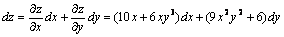 Определение. Производная от функции z=f(x, у) по х, найденная в предложении, что у остается постоянным, называется частной производной от z по х и обозначается или f'x (x, у). Аналогично определяется и обозначается частная производная z по у. Если функция z=f(x, у) имеет в точке (х, у) непрерывные частные производные, то ее полное приращение может быть представлено в виде: , (1) где при . Определение. Выражение является главной частью полного приращения Δ z и называется полным дифференциалом функции z=f(x, у) и обозначается dz: . (2) Полагая в формуле (2) z равным х, найдем , а при z=y . Поэтому . (3) Из (1) следует, что . Функция f(x, y) называется дифференцируемой в точке (х, у), если она имеет в этой точке полный дифференциал. Пример. Найти полный дифференциал функции . Решение. Сначала найдем частные производные Производная найдена в предположении, что у постоянна, а найдена в предположении, что х постоянна. По формуле (3): . Ответ. dz= (10 x– 6 xy 3) dx +(9 x 2 y 2+6) dy.