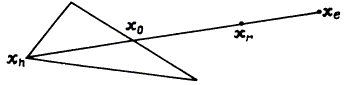 Замечание: Д. Сравним значения функций fr и fl. 1. Если fr < fl, то мы получили наименьшее значение функции. Направление из точки x0 в точку xr наиболее удобно для перемещения. Таким образом, мы производим растяжение в этом направлении и находим точку xe и значение функции fe = f(xe). (рис. 5) иллюстрирует операцию растяжения симплекса.