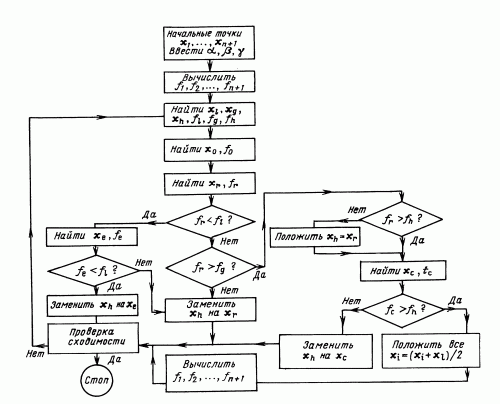 где Если Шаги этой процедуры представлены в виде блок-схемы на рис. 8. Коэффициенты Начальный симплекс выбирается на наше усмотрение. В данном случае точка x1 является начальной точкой, затем формируются точки