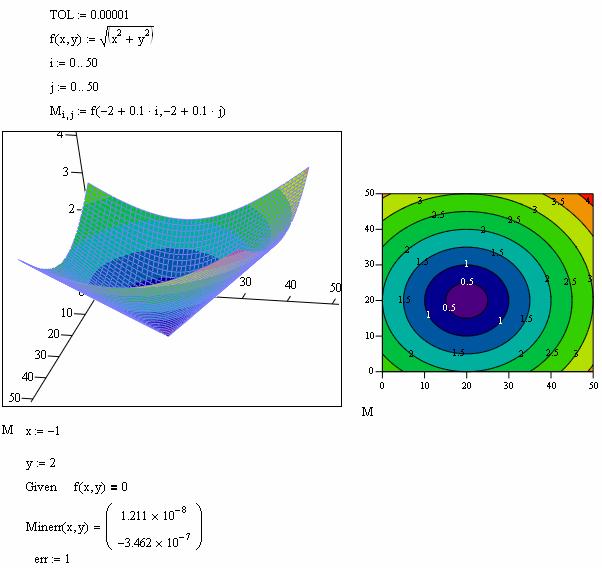 Поиск экстремума функции нескольких переменных c помощью функции Minerr: · x1: =C1,..., хм: =См — начальные значения для неизвестных; · Given — ключевое слово; · система алгебраических уравнений и неравенств, записанная логическими операторами; · Minerr (x1,..., хм) — приближенное решение системы относительно переменных x1, ..., хм, минимизирующее невязку системы уравнений.