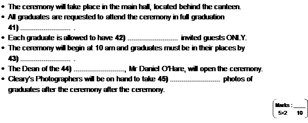 31 Seamus had never been to a U2 concert. ……….. 32 He was running late and got to the concert in a hurry. ……….. 33 It was very crowded so he was at the back, far away from the stage. ……….. 34 There was a problem with the electricity at the concert. ……….. 35 Some of the crowd became angry when the band was late coming on stage. ……….. 36 The group played both old and recent songs. ……….. 37 There were fireworks during the show. ……….. 38 The lead singer, Bono, was not on the stage. ……….. 39 Seamus went to the concert on his own. ……….. 40 Seamus suggested that they go to a concert together in the future. ………..