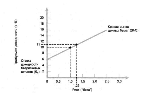 Графическое выражение модели оценки доходности активов (САРМ) называется кривой рынка ценных бумаг (SML). Кривая рынка ценных бумаг – это графическое изображение модели оценки доходности активов; отражает требуемую доходность инвестора для определенного уровня недиверсифицируемого риска, измеренного фактором " бета" Перенося параметры модели в систему координат, мы обнаружили бы, что кривая рынка ценных бумаг действительно будет прямой линией. Она показывает требуемую доходность, которую получил бы инвестор на фондовом рынке, для каждого уровня недиверсифицируемого риска. Модель можно построить, просто вычислив требуемую доходность для разных значений фактора " бета", оставляя ставку доходности безрисковых активов и рыночную доходность постоянными. Например, как мы видели ранее, при ставке доходности безрисковых активов, равной 6%, и рыночной доходности в 10% требуемая доходность будет равна 11%, когда фактор " бета" равен 1, 25. Увеличьте фактор " бета" до 2 — и требуемая доходность будет составлять 14% 6% + [2× (10% - 6%)] = 14%. Аналогично мы можем найти требуемую доходность для различных значений фактора " бета" и закончить следующими комбинациями риска (" бета") и требуемой доходности: