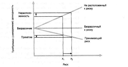 Инвестор, безразличный к риску, не требует изменений в доходности при данном увеличении риска, в то время как не расположенный к риску инвестор склонен требовать роста доходности при данном увеличении риска, а принимающий риск инвестор готов поступиться частью дохода при данном увеличении риска. Большинство инвесторов относятся ко второму типу.