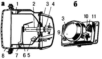 Рисунок 3 Прямоугольная фара с галогенной лампой: а – устройство; б – расположение ручек регулировки; 1 – отражатель; 2 – галогенная лампа; 3 – крышка; 4 – соединительная колодка; 5 – лампа габаритного света; 6 – экран; 7 – корпус; 8 – рассеиватель; 9 – ручка регулировки в горизонтальной плоскости; 10 – ручка корректора; 11 – ручка регулировки в вертикальной плоскости. – Ручку 10 корректора устанавливают в два положения, соответствующие полной нагрузке и не-нагруженному состоянию автомобиля. Для замены лампы снимают крышку 3. Регулировка светораспределения фар в горизонтальной и вертикальной плоскостях осуществляется ручками 9 и 11. Доступ к регулировочным ручкам предусмотрен со стороны подкапотного пространства автомобиля.