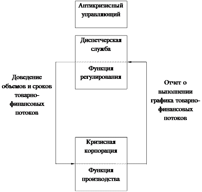 Рис. 2.2. Структура решаемых задач Исполнение первоочередных задач возлагается на службу диспетчеров, в компетенцию которых входит регулирование товарных и финансовых потоков по объемам и времени. Функция управляющего по регулированию потоков называется диспетчированием. Основанием для регулирования служит план финансового оздоровления корпорации, в котором рассчитаны контрольные объемы и даты проведения финансовых операций. Процесс диспетчирования (рис. 2.3) представляет собой двухполюсную систему с обратной связью. Обратная связь необходима для получения полной и своевременной информации как от управляющего к корпорации, так и в обратном направлении. Таким образом, процесс диспетчирования сопровождает весь процесс антикризисного управления и его этапы повторяются многократно в ходе финансового оздоровления корпорации.