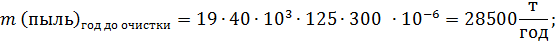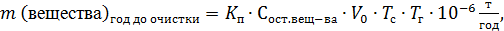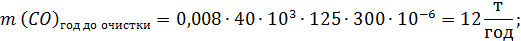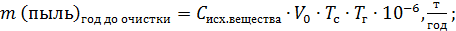 где Сисх.вещества – исходная концентрация вещества до очистки, г/нм3; V0 – объем газа при нормальных условиях (V0 = 40 тыс.нм3/час); Тс – время работы технологического агрегата, час/сутки (Тс = 125); Тг – время работы технологического агрегата, дней/год (Тг = 300).