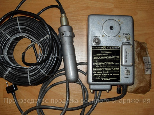 Прилади радіаційної розвідки Індикатор-сигналізатор ДП-64 (рис. 2) призначається для постійного нагляду та визначення початку радіоактивного зараження Прилад працює в режимі спостереження і забезпечує звукову та світлову сигналізацію через 3 сек. після досягнення рівня радіації—випромінювання 0, 2 Р/год. Наявність γ - випромінювання визначається за спалахами неонової лампочки та звуковим сигналом. Пульт встановлюється в приміщенні, а датчик розміщується ззовні. Живлення приладу здійснюється від мережі напругою 220/127 В або акумулятора.
