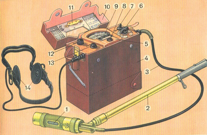 Рис. 4- Вимірювач потужності дози (рентгенометр) ДП-5В: 1 - блок детектування; 2 - продовжувальна штанга; 3 – кабель; 4 – футляр; 6 - кнопка скидання показника мікроамперметра; 7 - перемикач піддіапазонів; 8 - лампа підсвітки; 9 - мікроамперметр; 10 - кришка; 11 - тумблер підсвідки шкали мікроамперметра; 14 - головні телефони;