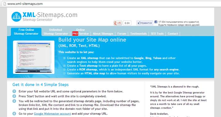 Для поисковиков надо создать карту сайта в формате.xml. Для этого можно воспользоваться онлайн-генератором https://www.xml-sitemaps.com, который бесплатно обрабатывает до 500 страниц (рис. 39).