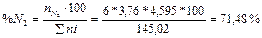Вычисленный объём образующихся в ходе реакции продуктов горения обычно незначительно превышает объём воздуха, необходимого для полного сгорания вещества. Процентный состав компонентов продуктов горения рассчитывается по их объёмным и мольным долям или процентам. Общий объём VПГ или общее количество вещества продуктов горения å nПГ принимается за 100 %. В мольных процентах: