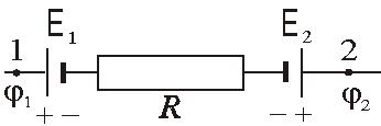 Применим обобщённый закон Ома к участку цепи, изображённому на рис. 2. При решении задач с использованием обобщённого закона Ома направление тока, а также направление обхода контура выбираются произвольно. Выберем условно положительное направление тока, как показано на рисунке, и направление обхода от точки 1 к точке 2. Тогда для участка цепи 1 – E – R – 2 получим: