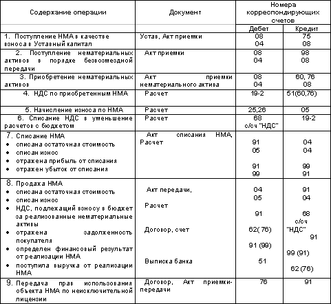 В случае приобретения нематериальных активов для использования в производстве товаров, работ и услуг, освобожденных от обложения НДС, сумма уплаченного НДС относится на счет 04. Основные проводки по учету нематериальных активов
