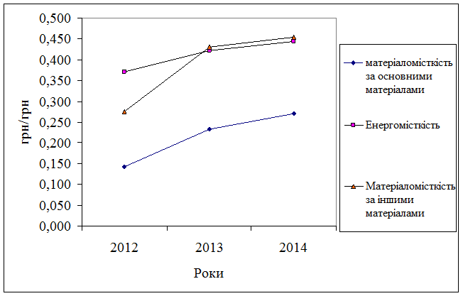 Як бачимо, протягом аналізованого періоду матеріаломісткість продукції зростає з 0, 460 грн./грн. у 2012 р. до 0, 666 грн./грн. у 2014 р., відносний ріст склав 44, 8%. Таке зростання матеріаломісткості є негативним для підприємства, оскільки зростання матеріаломісткості збільшує суму матеріальних витрат.