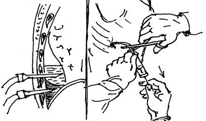 Показания. Торакоцентез проводят с диагностической (выявить наличие выпота или крови) и лечебной целью (удаление выпота, крови, воздуха и введение лекарственных веществ). Локализация. При наличии воздуха в плевральной полости пункция производится на передней поверхности туловища во втором межреберье по среднеключичной линии по верхнему краю нижележащего ребра. При наличии в плевральной полости жидкости пункцию производят в VII-VIII межреберье по задней подмышечной или лопаточной линиям. Техника. Необходимо иметь иглу для катетеризации 18 калибра с резиновой трубкой и шприц Жане. Больной находится в вертикальном положении, сидит на стуле. Врач обрабатывает антисептиком свой руки и предполагаемое место пункции. Производит анестезию всех слоев мягких тканей, включая париетальный листок плевры, 0, 5% раствором новокаина или 1% раствором лидокаина. Иглой для катетеризации проводят прокол мягких тканей, упираются в ребро, а затем иглу проводят по верхнему края ребра, чтобы не повредить межреберные сосуды и нервы, проходящие вдоль нижнего края. После каждого отсасывания жидкости или воздуха, перед тем, как отсоединить шприц, на резиновую трубку накладывают зажим. При необходимости через эту же иглу в плевральную полость вводят лекарственные вещества. По окончании пункции иглу извлекают и накладывают стерильную повязку.