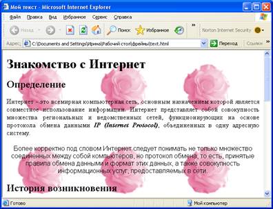 Повторение Повторить теги форматирования шрифта и его атрибуты; тег горизонтальной линии и его атрибуты. Фон Для того чтобы оформить фон на интернет страничке используется тег < BODY>, для которого придуманы два чудесных атрибута bgcolor и background. Чем же отличаются эти два атрибута? Рассмотрим bgcolor. Этот атрибут отвечает за цвет фона. Вы можете подставить любое значение цвета, в буквенном или в числовом выражении и ваш фон окраситься. Практика: На первом занятии мы сделали интернет страничку, откройте ее в Блокноте и внесите изменения в тег < BODY>: < body bgcolor=blue> Сохраните результат. Что получилось? Попробуйте изменить цвет: red, silver, lime. Цвет фона так же можно задавать в шестьнадцатиричным кодом, при этом не забудьте поставить знак # перед кодом цвета, например: #0000FF. Атрибут background отвечает не за цвет заливки фона, а за изображение, которое следует поместить в качестве фона или как еще говорят за фоновые обои. Обои можно подобрать любые, какие подскажет вам ваша фантазия. Практика: Скопируйте любое изображения с расширением.jpg в папку с интернет страничкой, которую мы сделали на первом уроке. Переименуйте файл в fon.jpg. Откройте интернет страничку в Блокноте и внесите изменения в тег < BODY>: < body background =”fon.jpg”> Сохраните страничку и откройте ее в браузере: