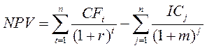где IС – первоначальное вложение средств; CFt – поступления денежных средств (денежный поток) в конце периода t; r – цена выбора или цена капитала (альтернативная стоимость коммерческой стратегии, предполагающей вложение денежных средств в инвестиционный проект). Необходимо отметить, что показатель NPV отражает прогнозную оценку изменения экономического потенциала инвестора в случае принятия рассматриваемого проекта. Этот показатель аддитивен во временном аспекте, т.е. чистый приведенный эффект различных проектов можно суммировать. Это очень важное свойство, выделяющее этот критерий из всех остальных и позволяющее использовать его в качестве основного критерия при анализе оптимальности инвестиционного портфеля. Если проект предполагает не разовую инвестицию, а последовательное инвестирование финансовых ресурсов в течение m лет, то формула для расчета NPV модифицируется следующим образом:
