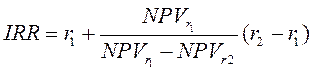 Таким образом, точка пересечения NPV-профиля с осью абсцисс – это и есть внутренняя норма доходности проекта IRR. Левее этой точки, т.е. когда цена капитала проекта меньше значения IRR, проект является доходным. Если же цена капитала проекта превышает значение IRR (на графике находится правее), проект входит в зону убытков. Для точного определения показателя IRR используют формулу линейной интерполяции: