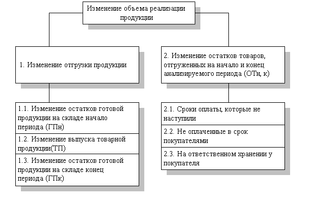 Анализ реализации продукции проводят каждый месяц, квартал, полугодие, год. В процессе его проведения сравнивают фактические данные с плановыми и предшествующим периодом. Рассчитывают процент выполнения плана, абсолютное отклонение от плана, темпы роста и прироста. На изменение объема реализации влияют многочисленные факторы (рис.1). Для анализа выполнения плана по объему реализации продукции составляется баланс ТП в двух оценках: по себестоимости и по отпускным ценам. Балансовое управление имеет вид: