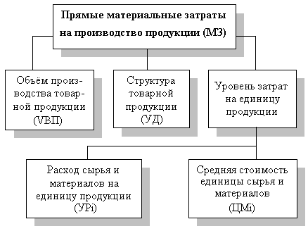 Как правило, наибольший удельный вес в себестоимости промышленной продукции занимают затраты на сырьё и материалы. Система факторов, оказывающих влияние на прямые материальные затраты, приведена на рис.12.