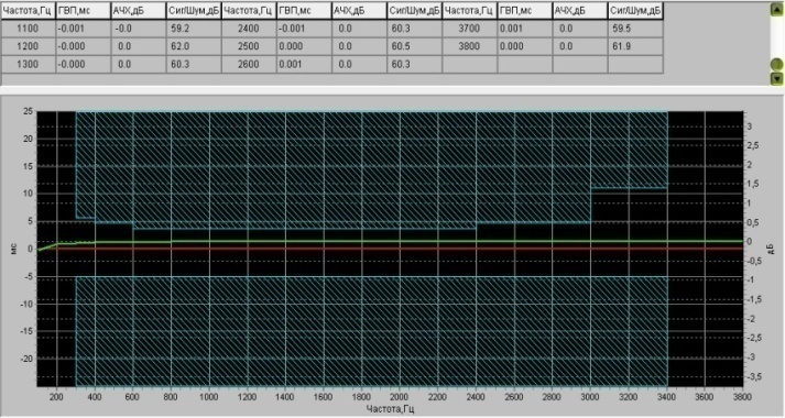 Рисунок 9 - Отклонение ОЗ в пределах нормы Если отклонение остаточного затухания в пределах нормы, график должен находиться в незакрашенной зоне (рис.9). Если на какой-то частоте отклонение ОЗ не соответствует норме, то в таблице это значение будет обведено синей рамкой. Кроме измеренных выше параметров анализатор позволяет наблюдать и другие параметры сигнала; такие как осциллограмма, спектр сигнала и т.д. Эти параметры отображаются в соответствующих окнах управляющей программы, ознакомьтесь с ними самостоятельно.